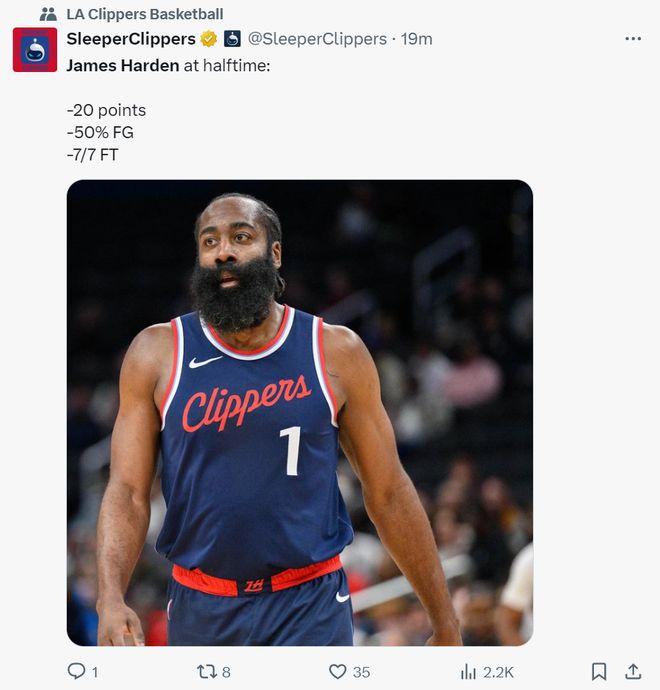上半场20分下半场0分!哈登突然断电快船立马崩盘 36岁老将又背锅