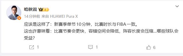 媒体人:新赛季CBA单节10分钟,比赛时长与FIBA一致